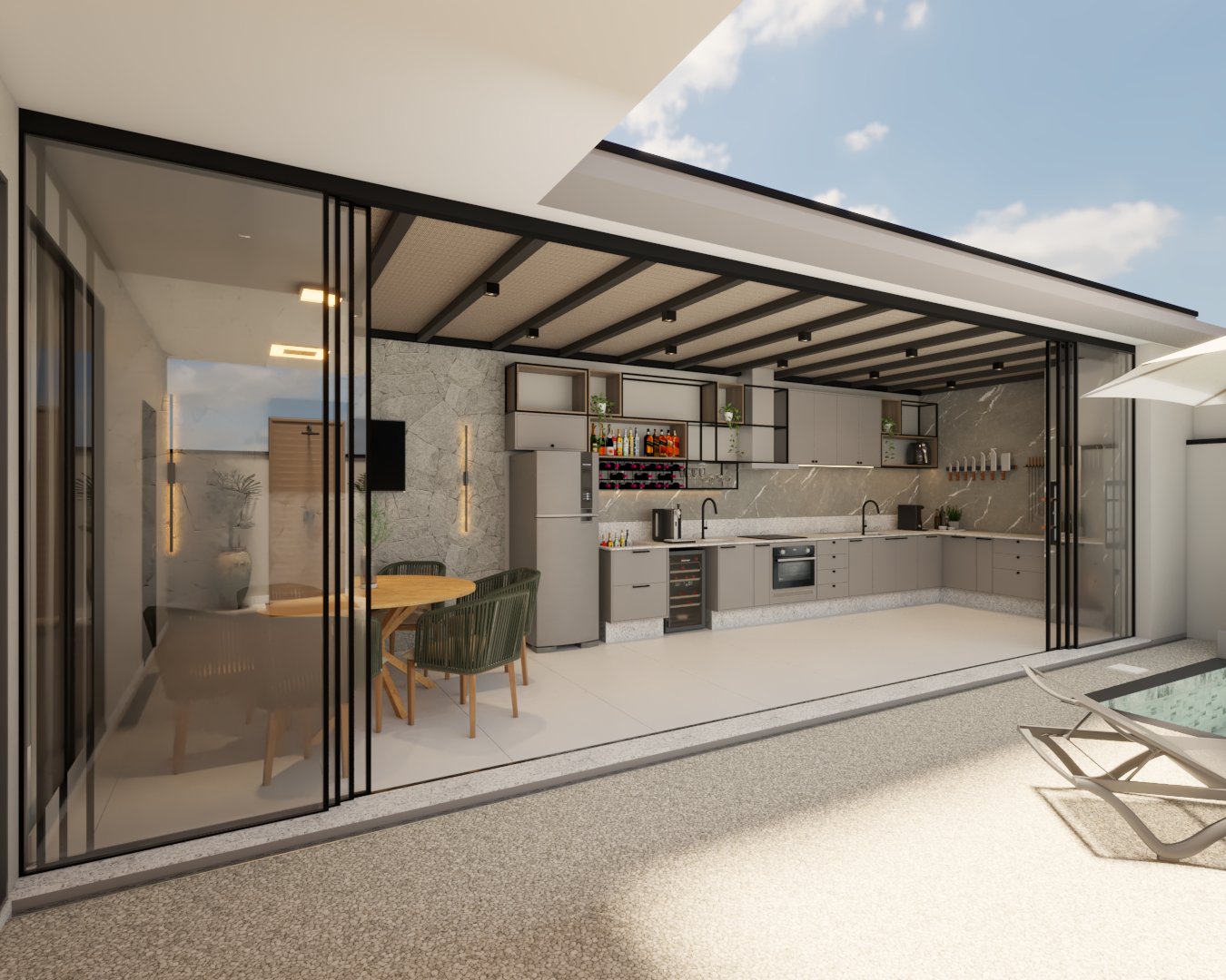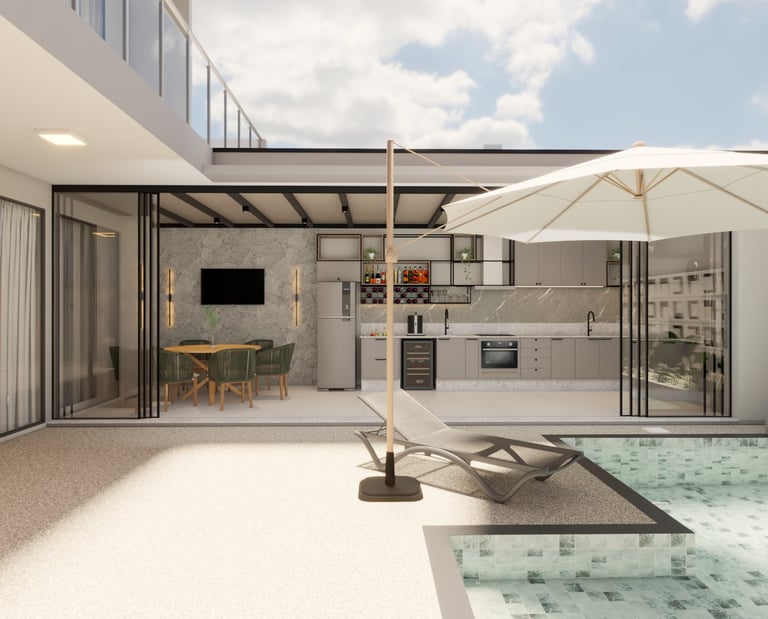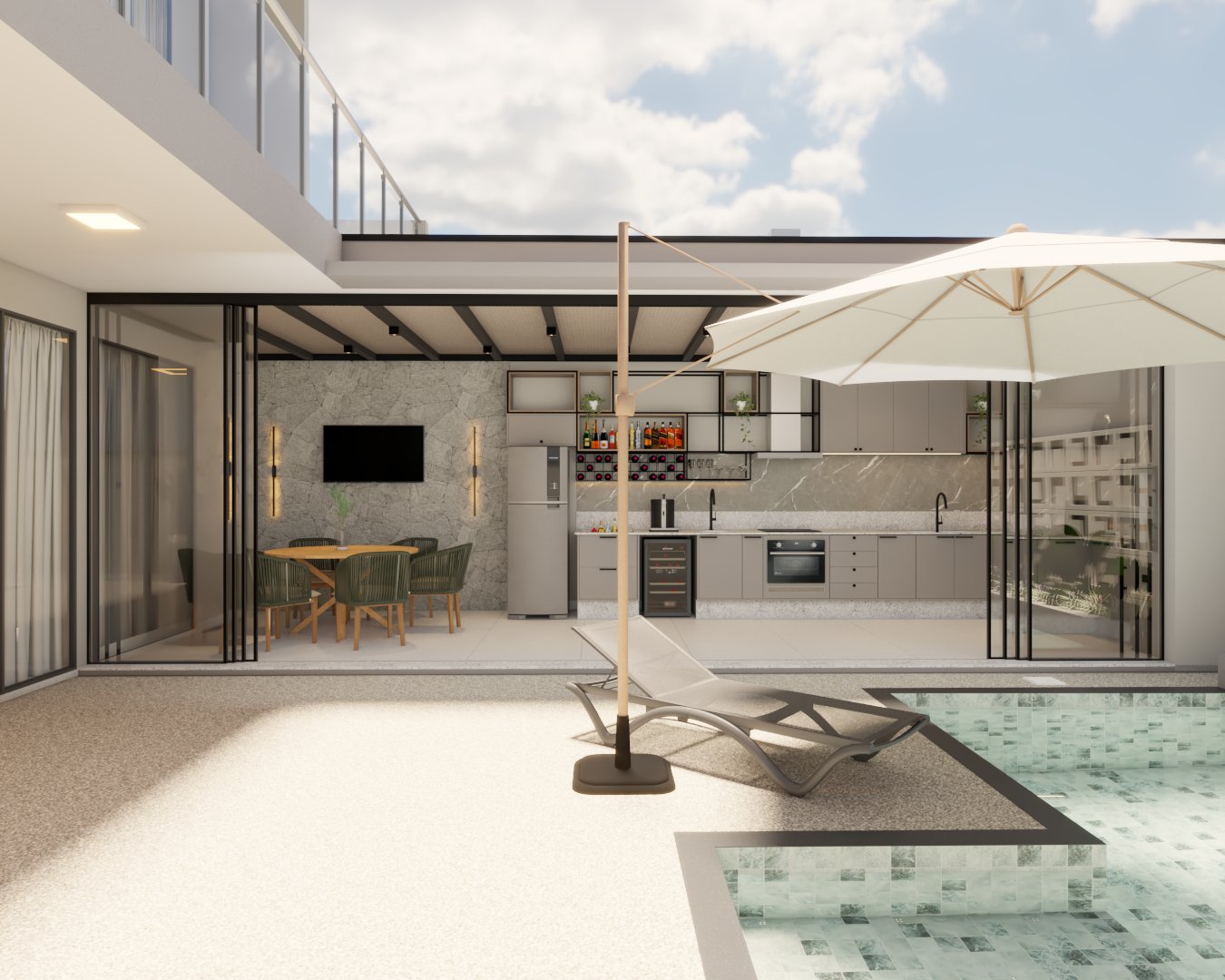 Desenvolvida a partir do desejo da família de transformar a nova casa em um lugar completo para viver e receber, esta área de lazer foi pensada para reunir em um único espaço tudo o que eles imaginavam para seus momentos de descanso e convivência. A proposta buscou integrar a área gourmet com o espaço externo e a piscina, criando um ambiente amplo, funcional e convidativo. As grandes aberturas em vidro permitem que interior e exterior se conectem de forma natural, ampliando a sensação de espaço e favorecendo a entrada de luz natural.