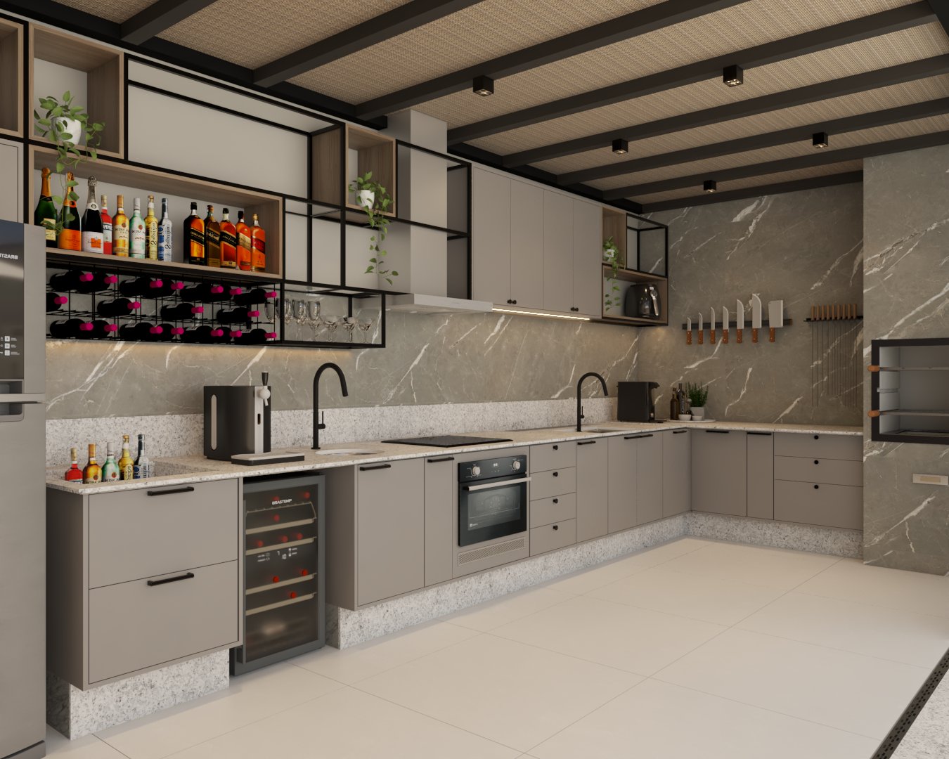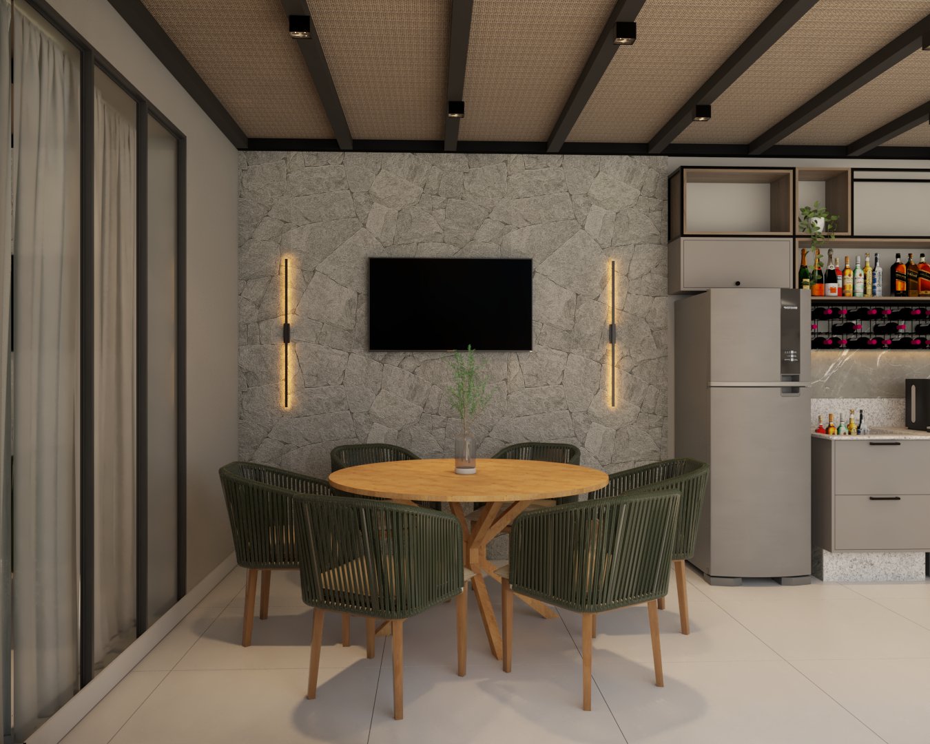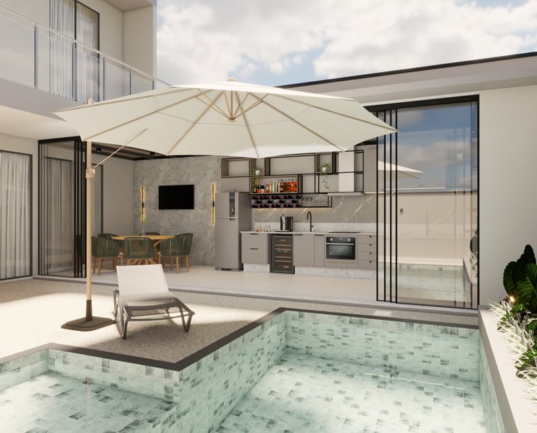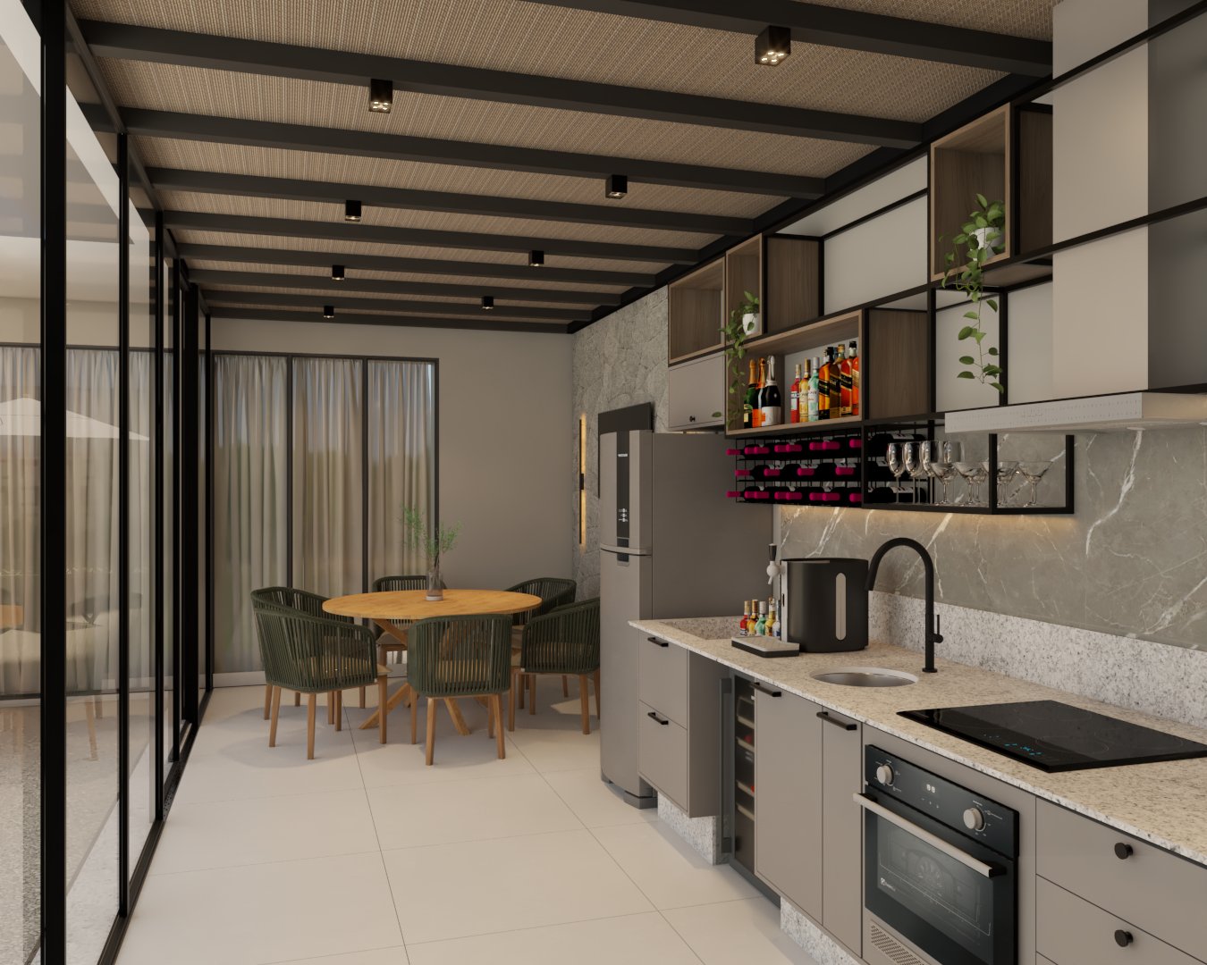 Desenvolvida a partir do desejo da família de transformar a nova casa em um lugar completo para viver e receber, esta área de lazer foi pensada para reunir em um único espaço tudo o que eles imaginavam para seus momentos de descanso e convivência. A proposta buscou integrar a área gourmet com o espaço externo e a piscina, criando um ambiente amplo, funcional e convidativo. As grandes aberturas em vidro permitem que interior e exterior se conectem de forma natural, ampliando a sensação de espaço e favorecendo a entrada de luz natural.