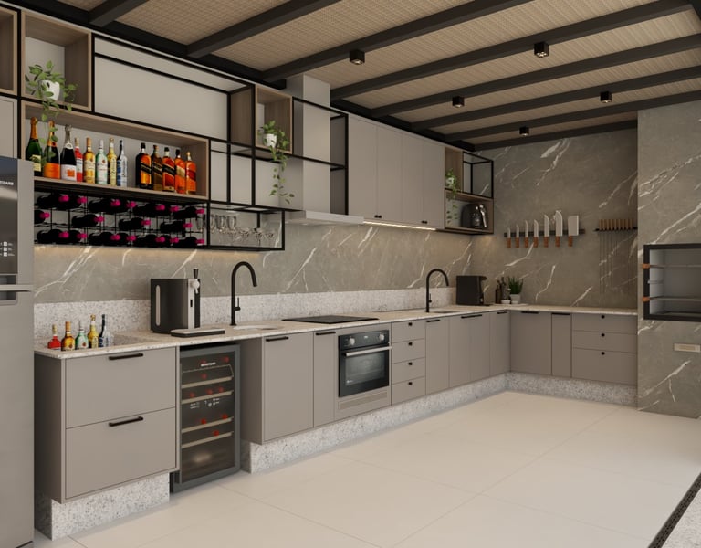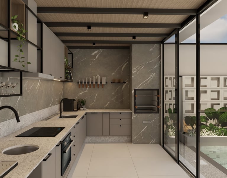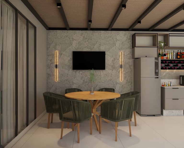 Na área gourmet, a composição de materiais neutros, revestimentos em pedra e elementos em madeira traz equilíbrio entre sofisticação e aconchego. A marcenaria e a bancada foram desenhadas para atender tanto ao uso cotidiano quanto aos momentos de encontro com amigos e familiares.