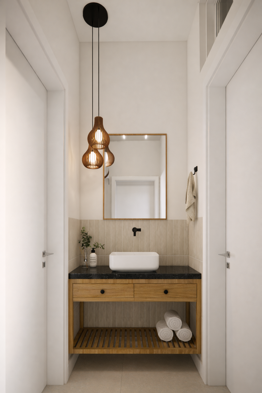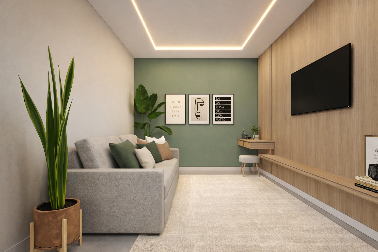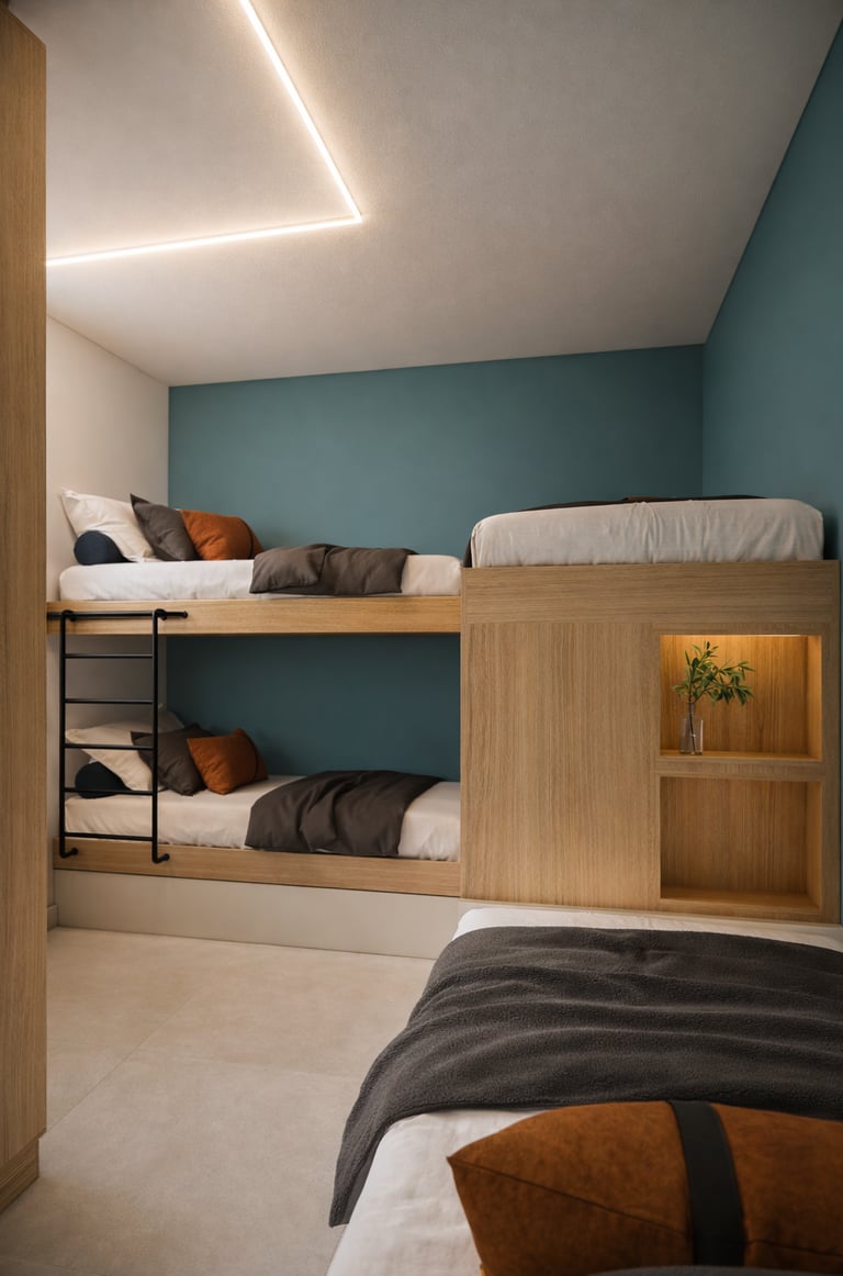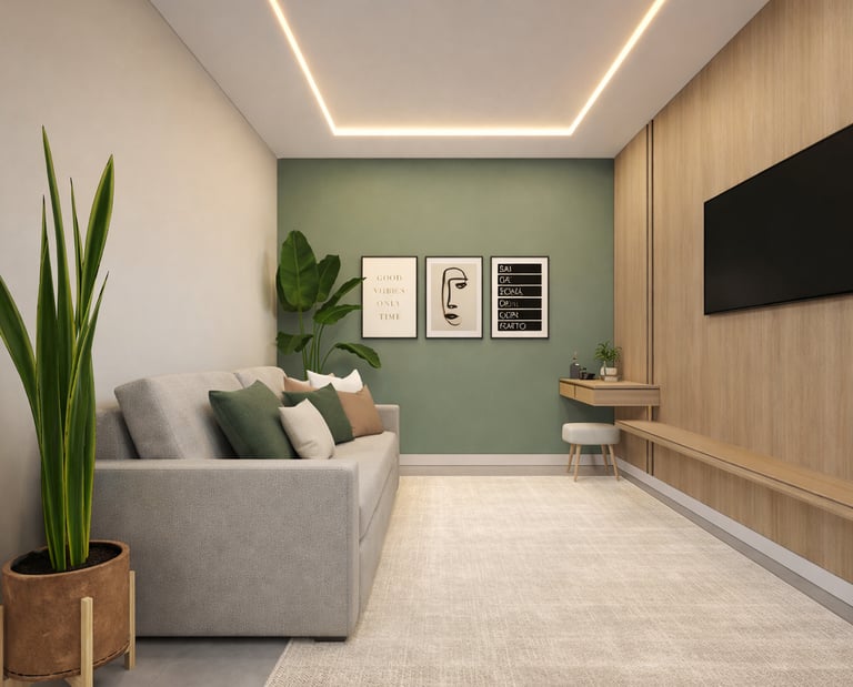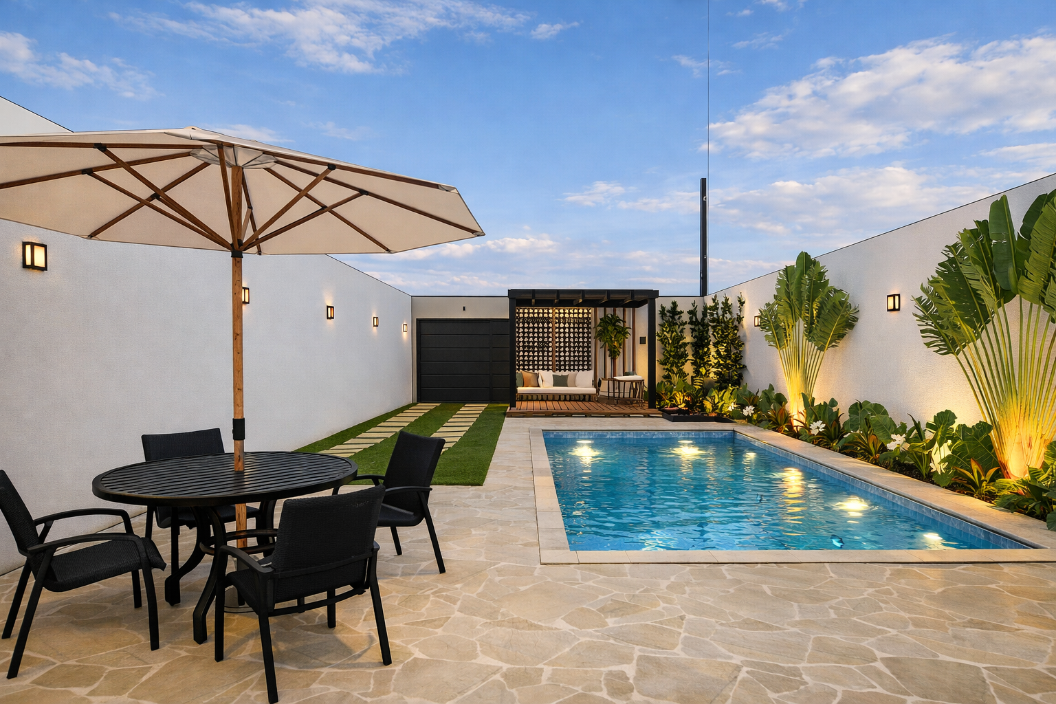 Na área de lazer, o paisagismo e a iluminação foram cuidadosamente planejados para valorizar a presença da vegetação e criar uma atmosfera acolhedora durante o dia e também à noite. Os materiais escolhidos, como madeira, revestimentos naturais e tons neutros, reforçam a sensação de conforto e equilíbrio visual.