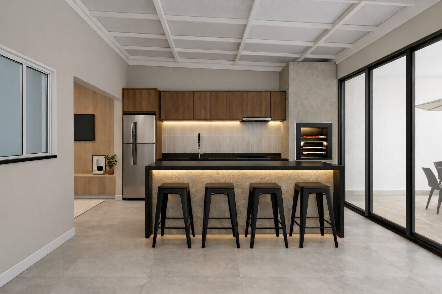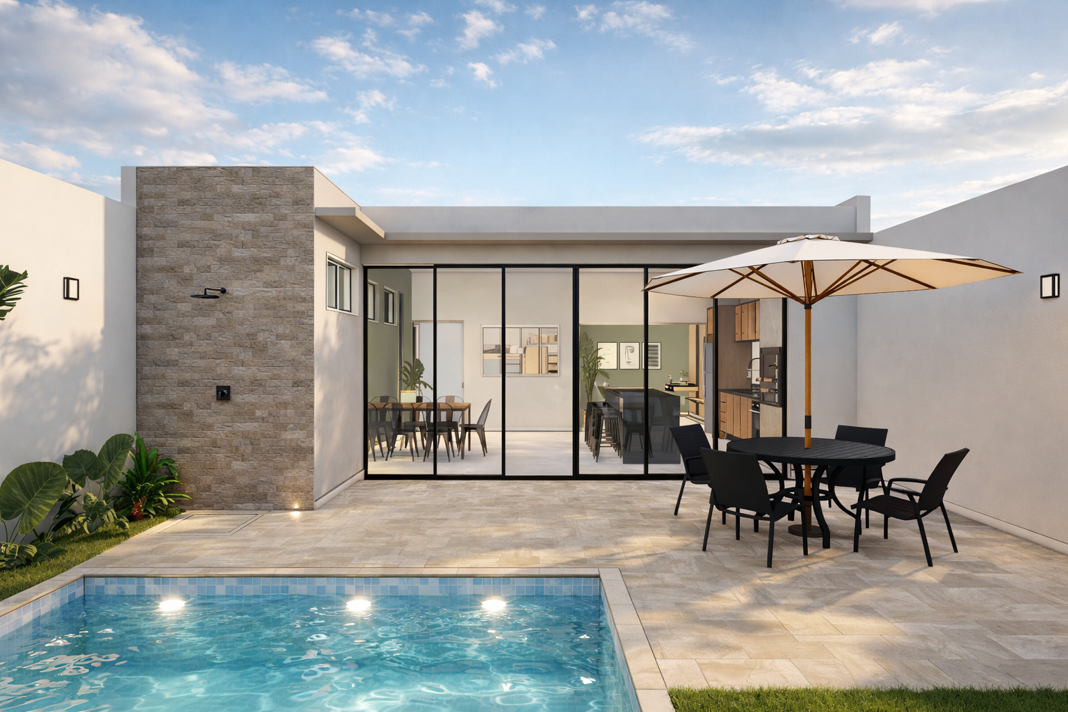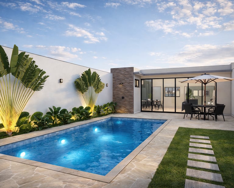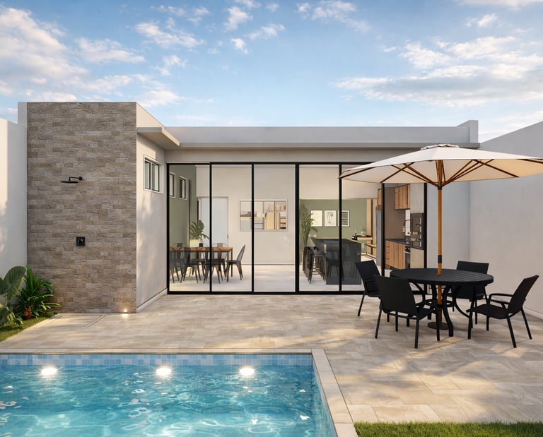 A composição valoriza linhas contemporâneas, volumes simples e uma paleta de materiais neutra, criando um ambiente equilibrado, elegante e atemporal. A arquitetura prioriza a integração entre os espaços internos e a área externa, conectando a área gourmet, a piscina e os ambientes de estar de forma fluida e natural. As amplas aberturas em vidro favorecem a entrada de luz natural e fortalecem a relação entre interior e paisagem.