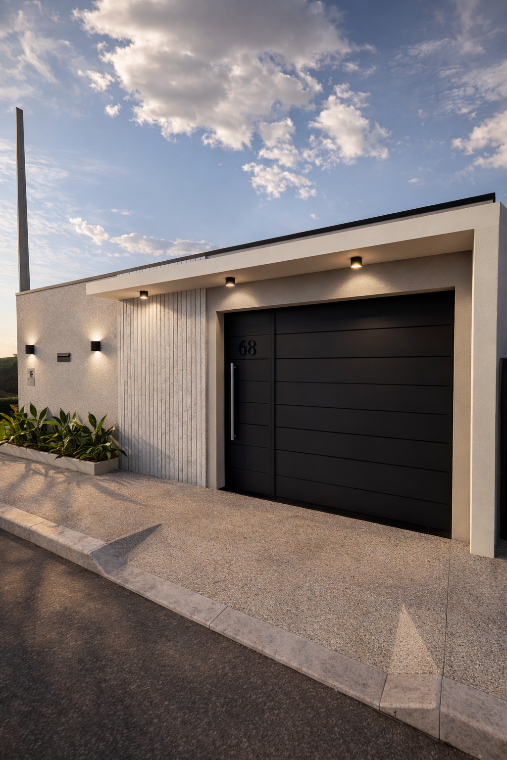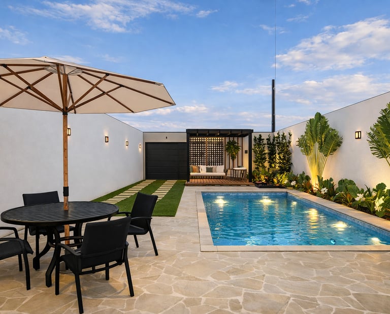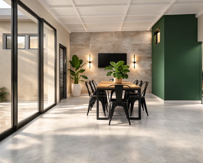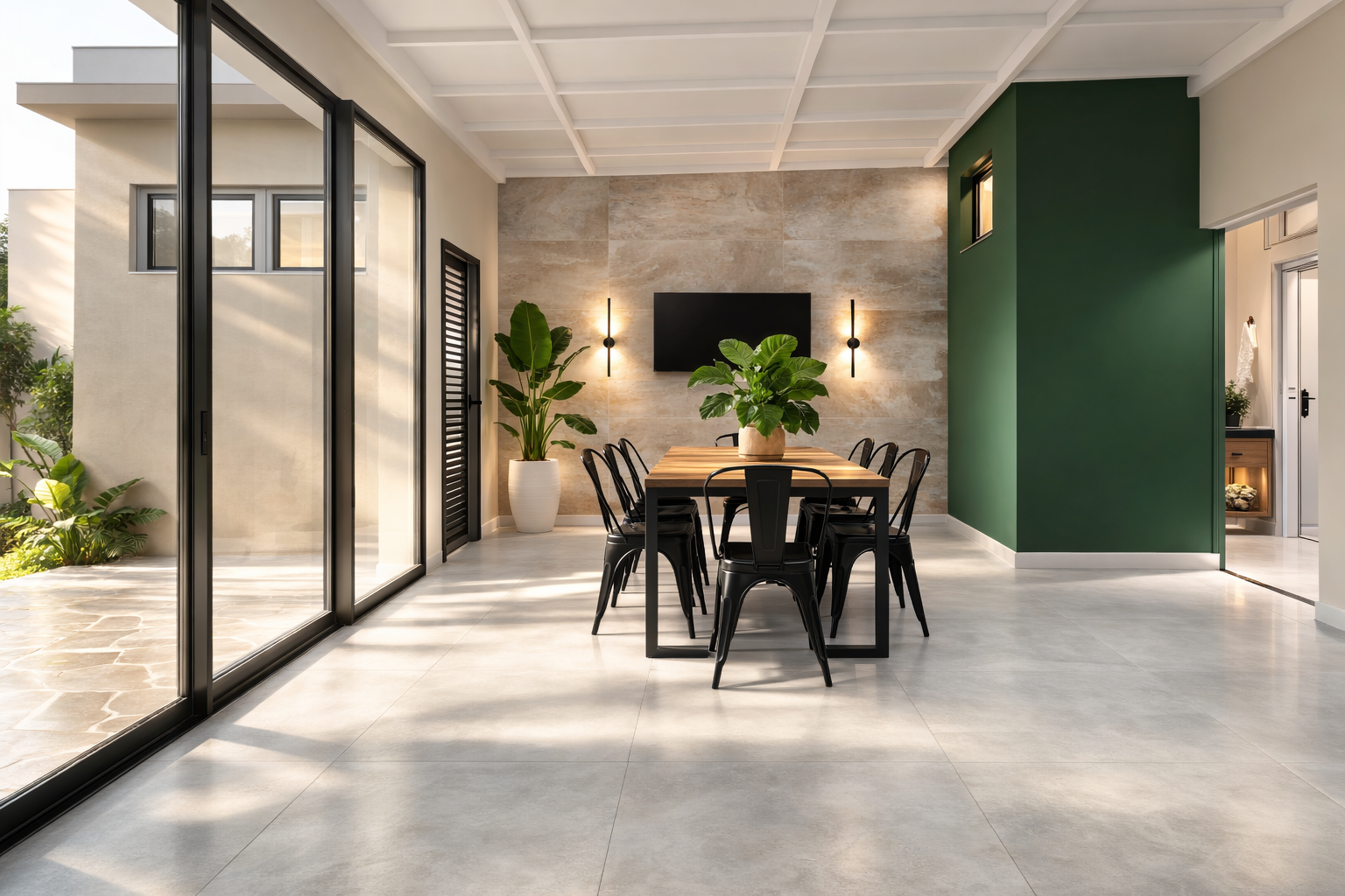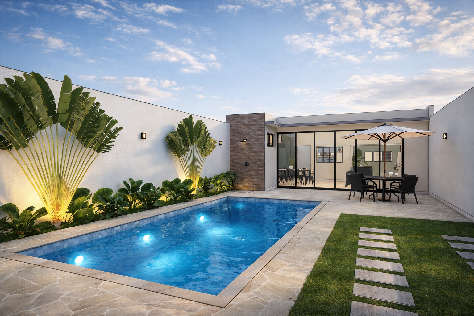 A composição valoriza linhas contemporâneas, volumes simples e uma paleta de materiais neutra, criando um ambiente equilibrado, elegante e atemporal. A arquitetura prioriza a integração entre os espaços internos e a área externa, conectando a área gourmet, a piscina e os ambientes de estar de forma fluida e natural. As amplas aberturas em vidro favorecem a entrada de luz natural e fortalecem a relação entre interior e paisagem.