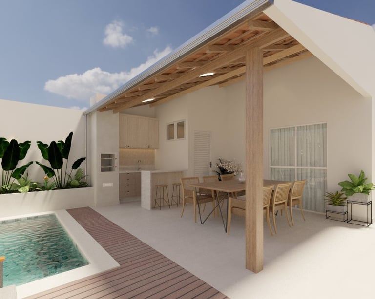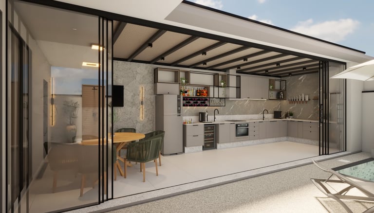 Integração entre área gourmet, piscina e convivência em um único espaço.