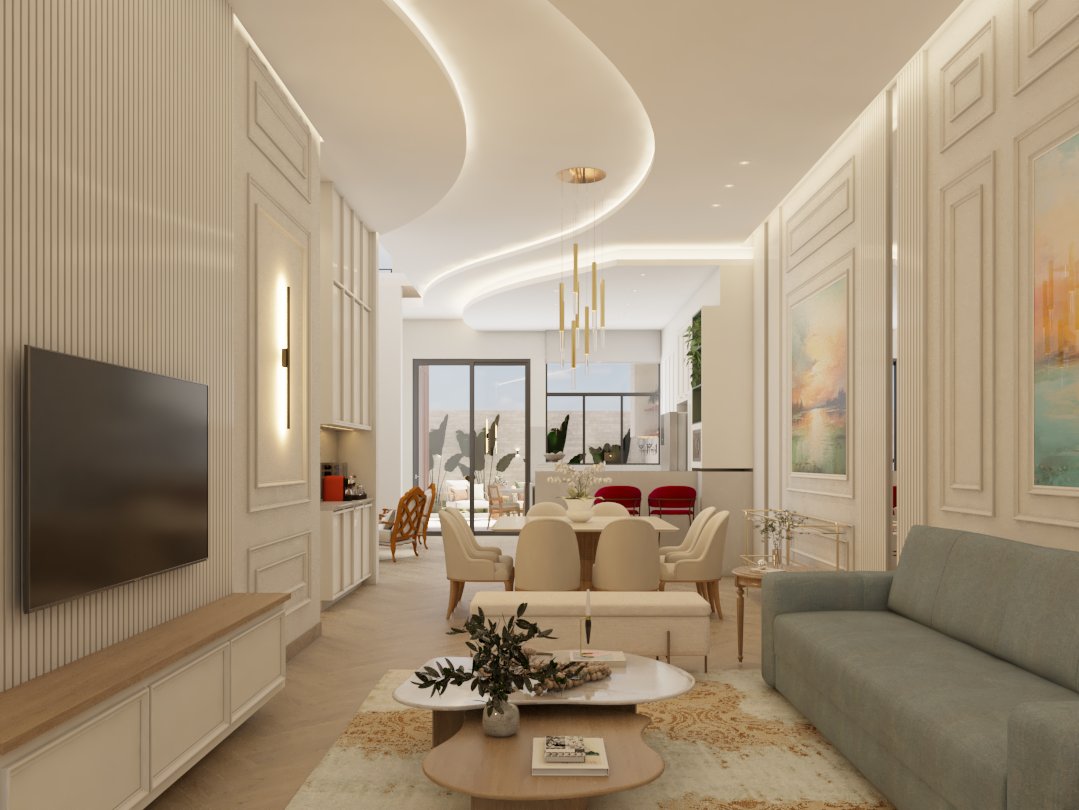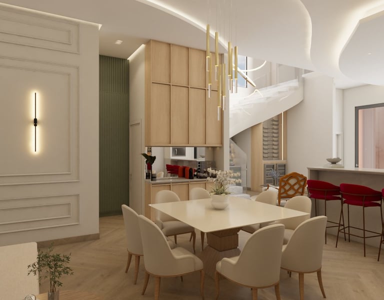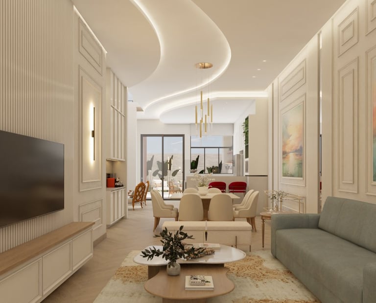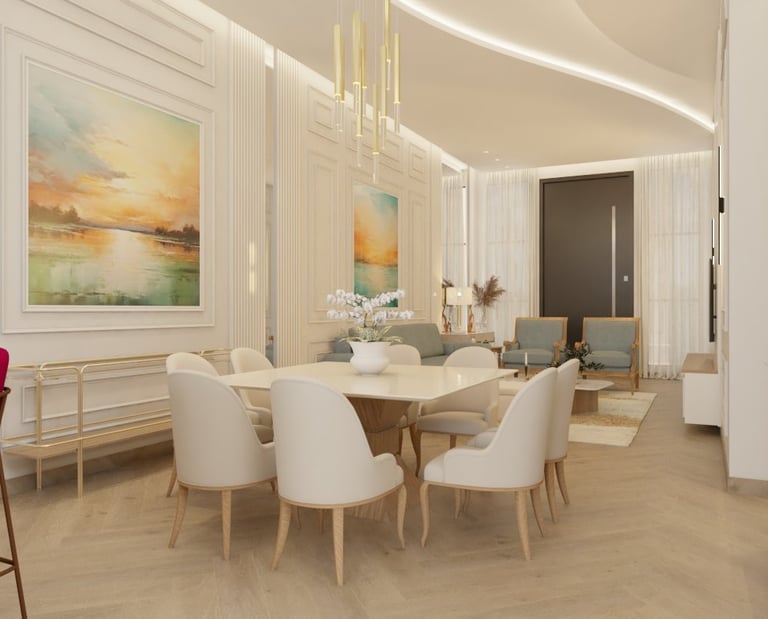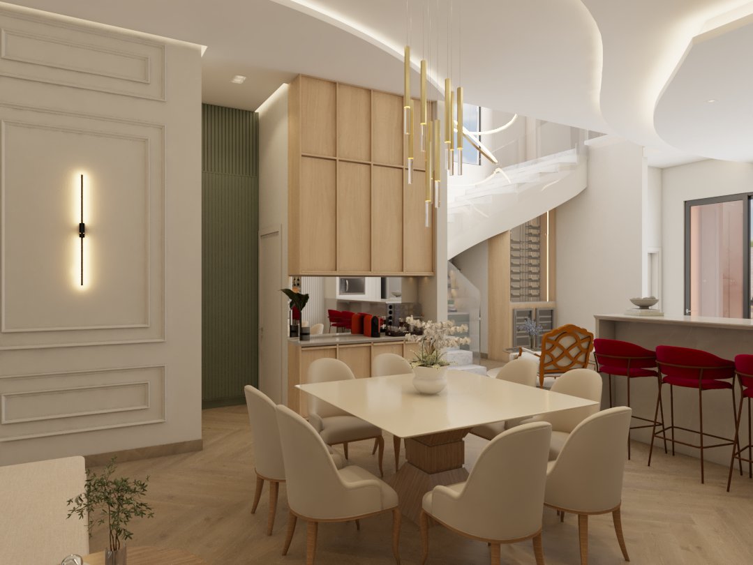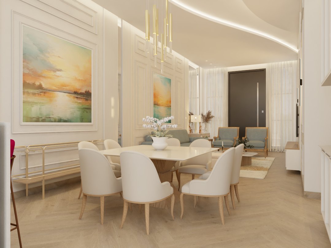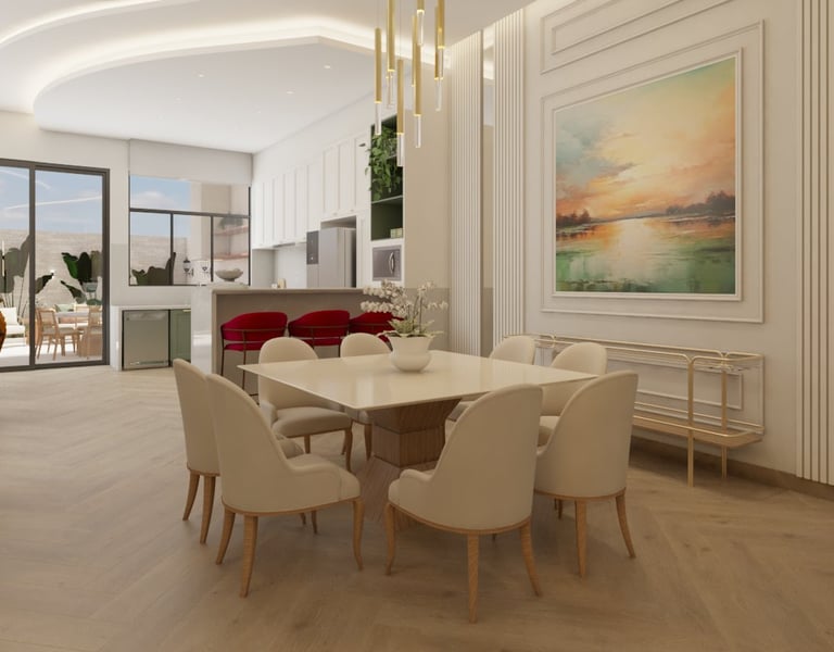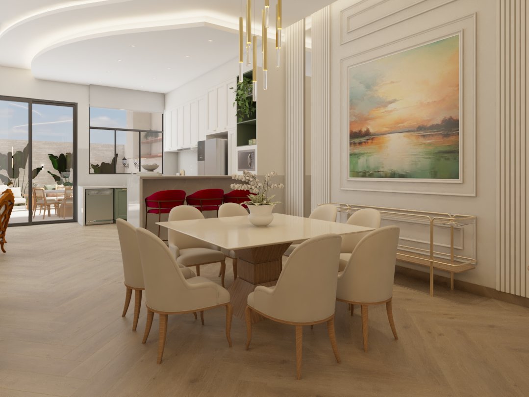O projeto traduziu o desejo do cliente por um ambiente clássico, elegante e acolhedor, sem abrir mão da leveza visual e da funcionalidade no dia a dia. A proposta partiu da valorização de uma base neutra, enriquecida por detalhes arquitetônicos marcantes e pela presença de cores suaves cuidadosamente inseridas na composição.