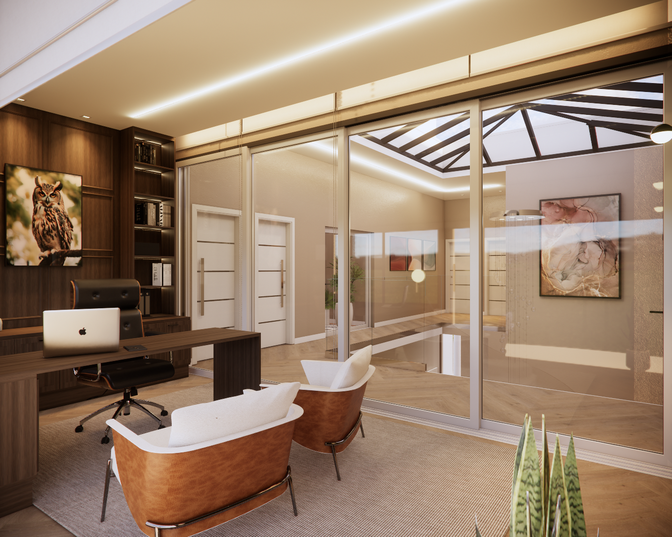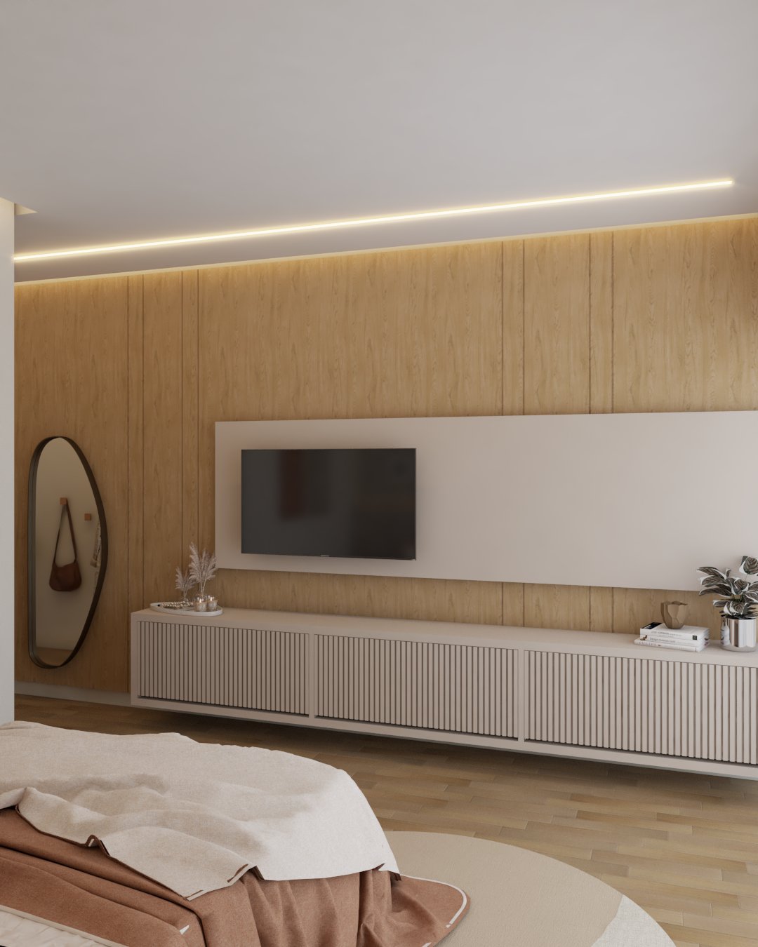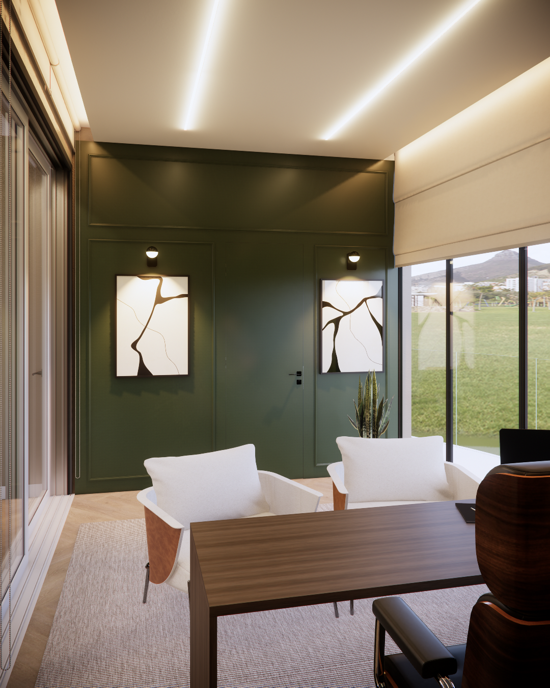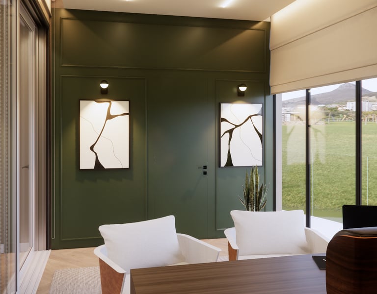 Elementos clássicos como as boiseries, os painéis e o desenho das paredes estruturam o espaço e trazem identidade ao projeto, enquanto os tons claros e os materiais naturais ajudam a manter a sensação de amplitude e equilíbrio visual. O desenvolvimento priorizou a harmonia entre sofisticação e conforto. A iluminação cênica, o desenho orgânico do forro e a escolha do mobiliário foram pensados para valorizar a atmosfera clássica do ambiente, criando um conjunto elegante e atemporal, mas ainda assim acolhedor e funcional para a rotina da casa.