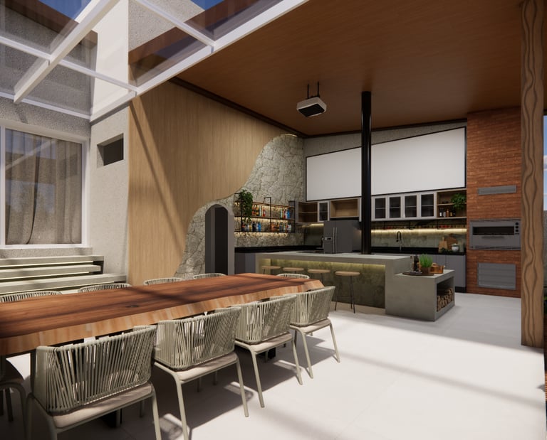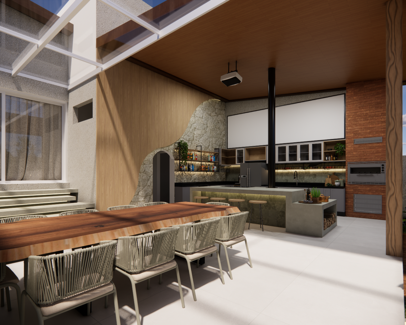 O projeto parte da ideia de permanência e acolhimento, criando um ambiente que convida ao uso frequente e à construção de memórias. A área de lazer foi concebida como o principal espaço de convivência da casa, pensada para momentos de encontro, refeições em família e celebrações com amigos.