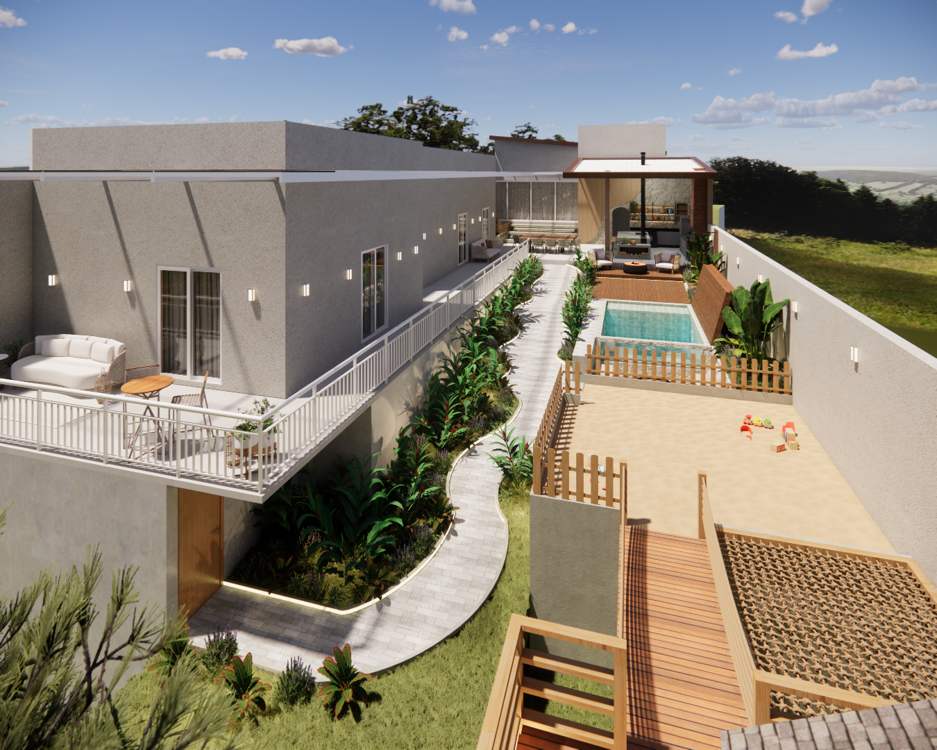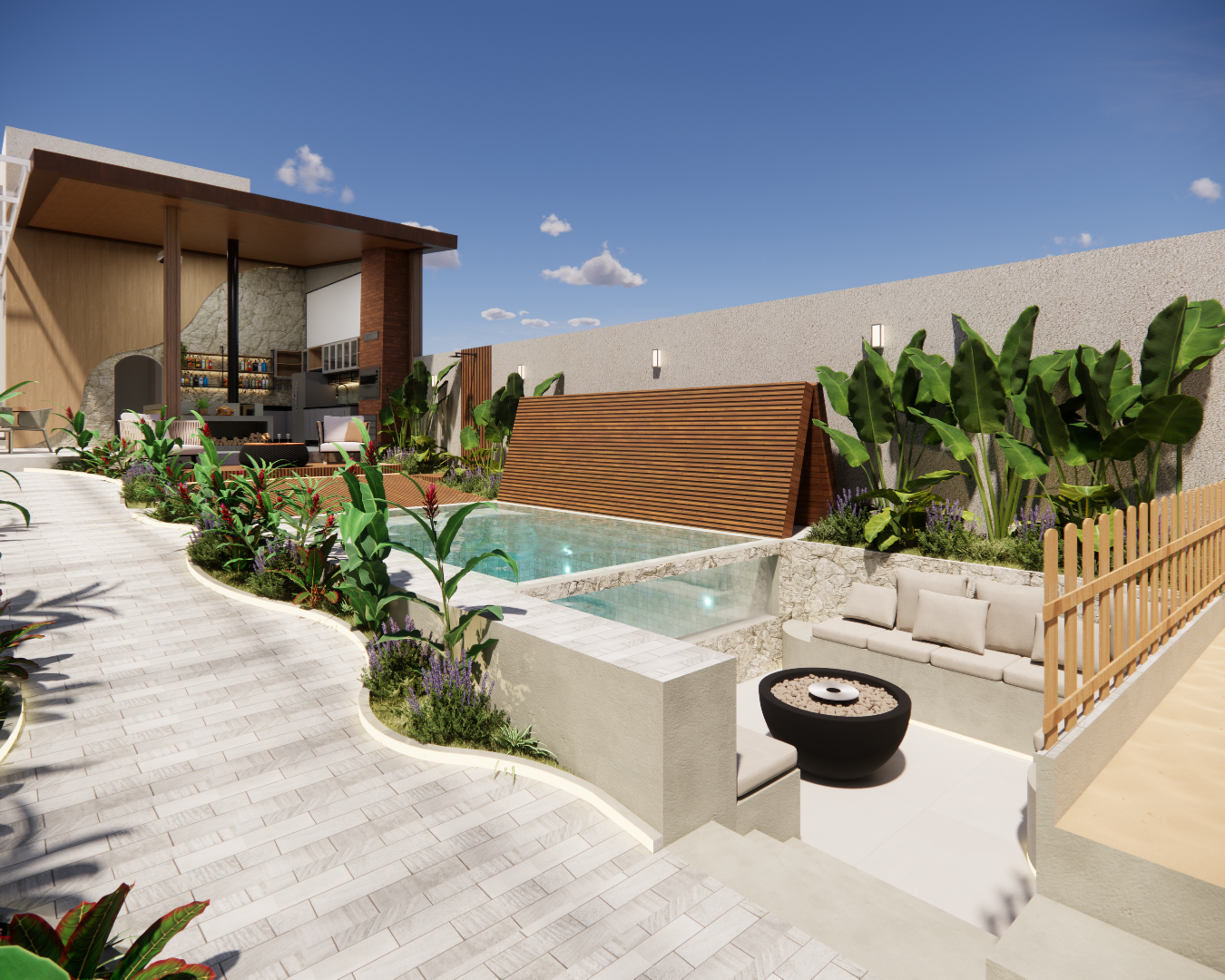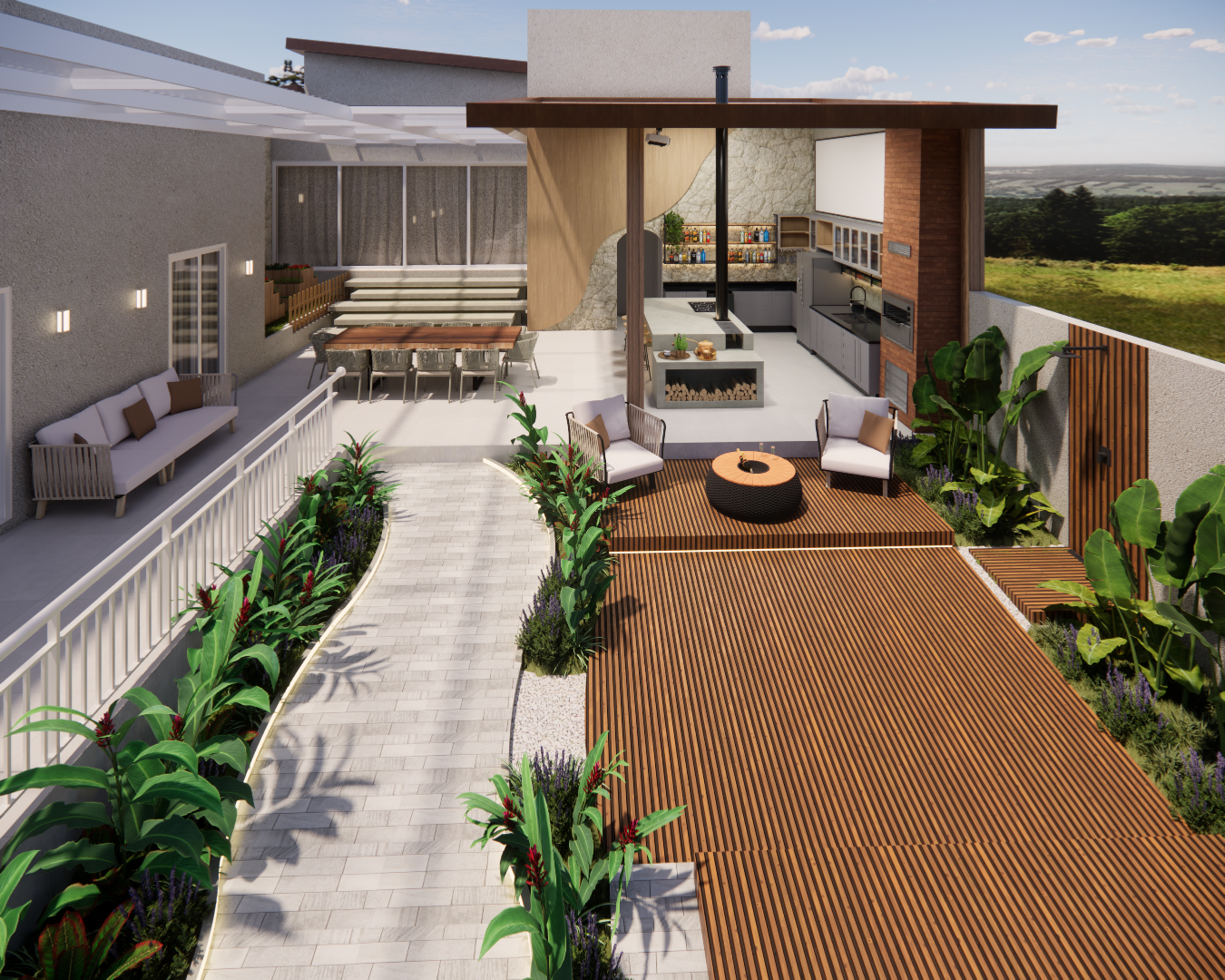 A organização do espaço valoriza o percurso e a integração entre os ambientes, conectando piscina, área gourmet e estar externo de forma natural. A combinação de materiais, o desenho do paisagismo e a definição dos usos foram pensados para garantir funcionalidade no dia a dia e conforto nos momentos de reunião.