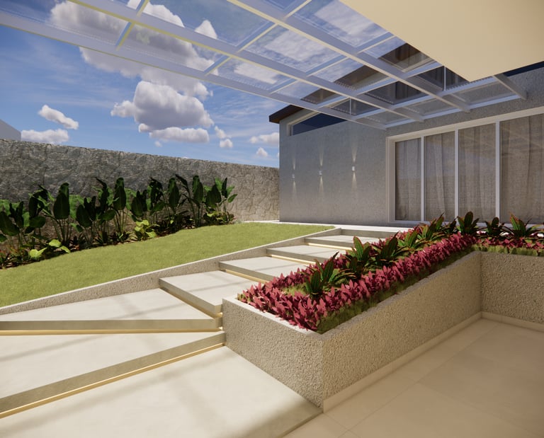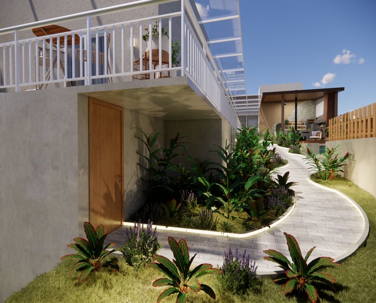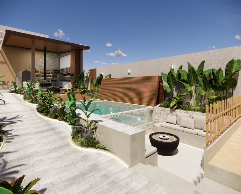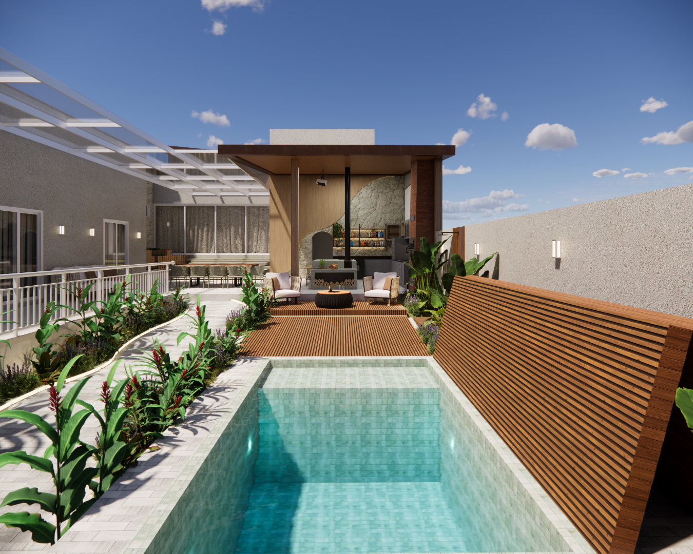 A organização do espaço valoriza o percurso e a integração entre os ambientes, conectando piscina, área gourmet e estar externo de forma natural. A combinação de materiais, o desenho do paisagismo e a definição dos usos foram pensados para garantir funcionalidade no dia a dia e conforto nos momentos de reunião.